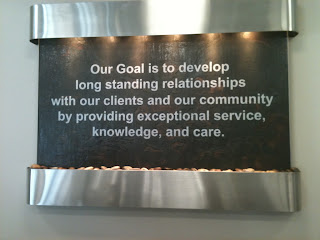 How soothing to view our mission statement behind a waterfall. Come on down and see and also help yourself to a fresh brewed cup of coffee from our Miele built in coffee maker. I promise to be back on a regular basis.